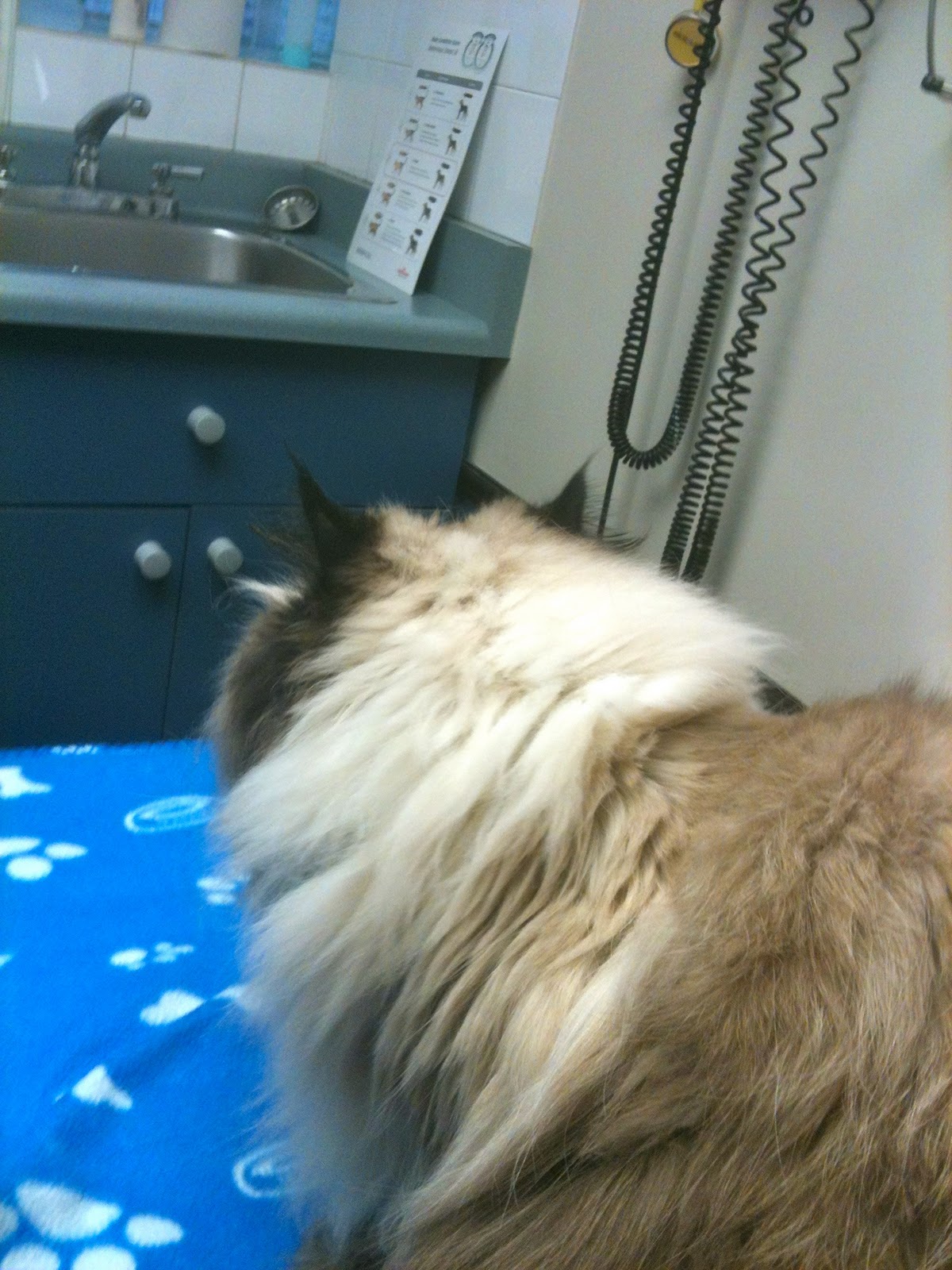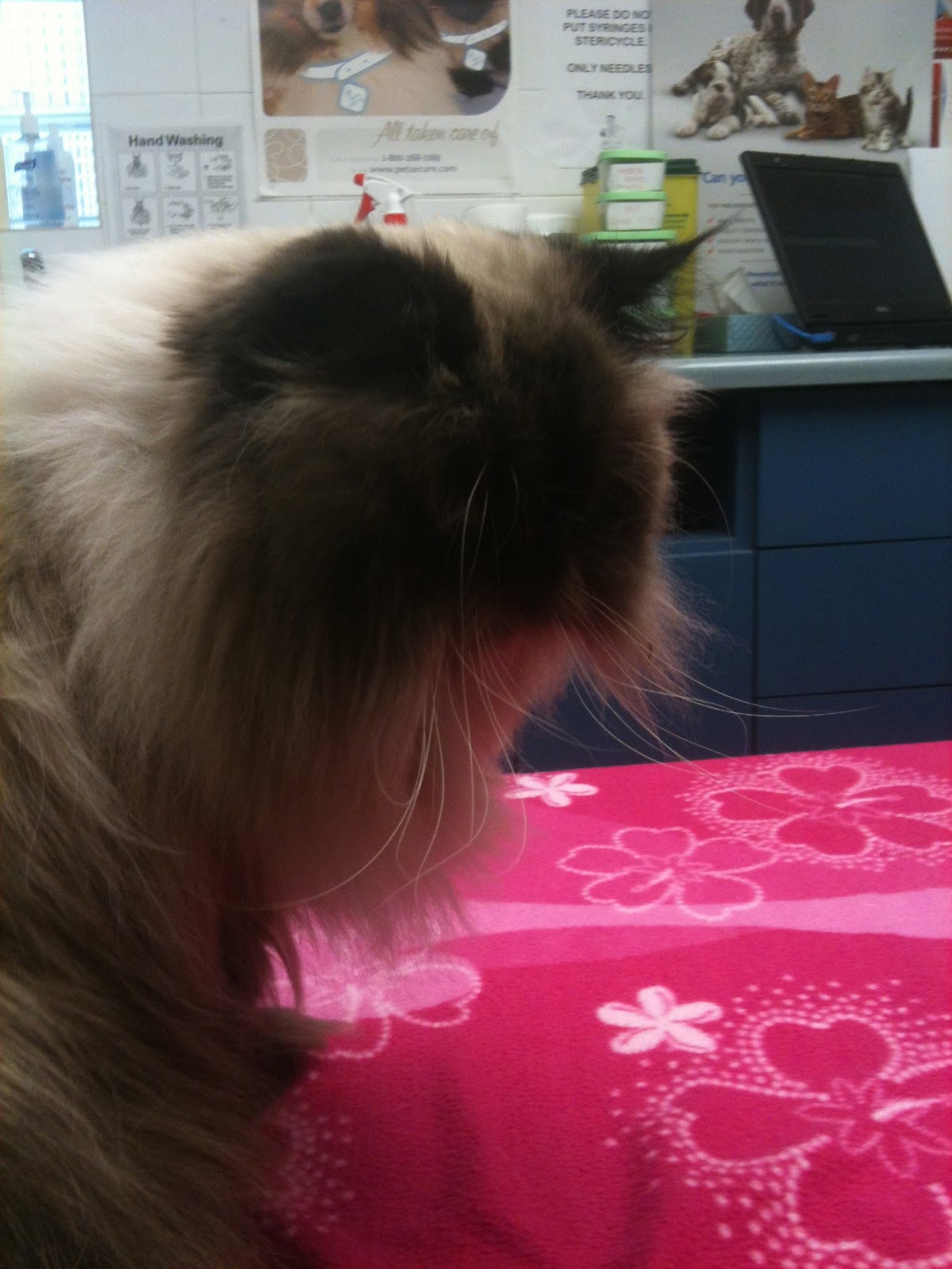 When I spoke with the vet on the phone yesterday, she had told me that this might mean he was "clogged up" again and that if it continued into the next day that I should bring him back in. So this afternoon around 12:30, I dropped everything I was doing and hauled Kitten back to the vet.