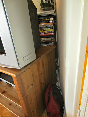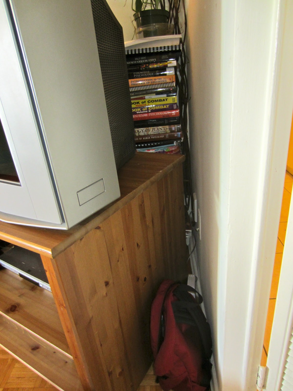 I began to call his name. He didn't come. It then occurred to me that I should take my earplugs out. I then heard a faint scuffling sound coming from under the TV. I pulled the kitchen door open, which had been slightly ajar, to find the plant lying on the ground behind the TV along with a pile of books that had once been propping it up.