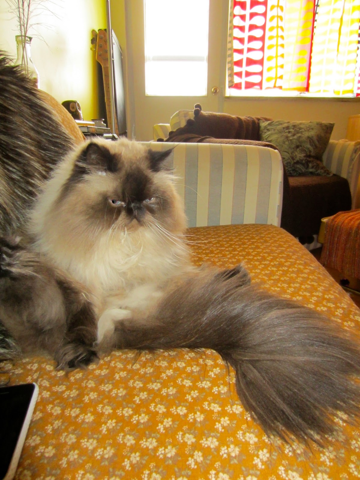 This was the story that I sat down to write. But as soon as I sat down to begin telling you about Kitten's mission of plant destruction, I heard a thud. Kitten had jumped past the statue in my very presence and had become lodged behind the TV.