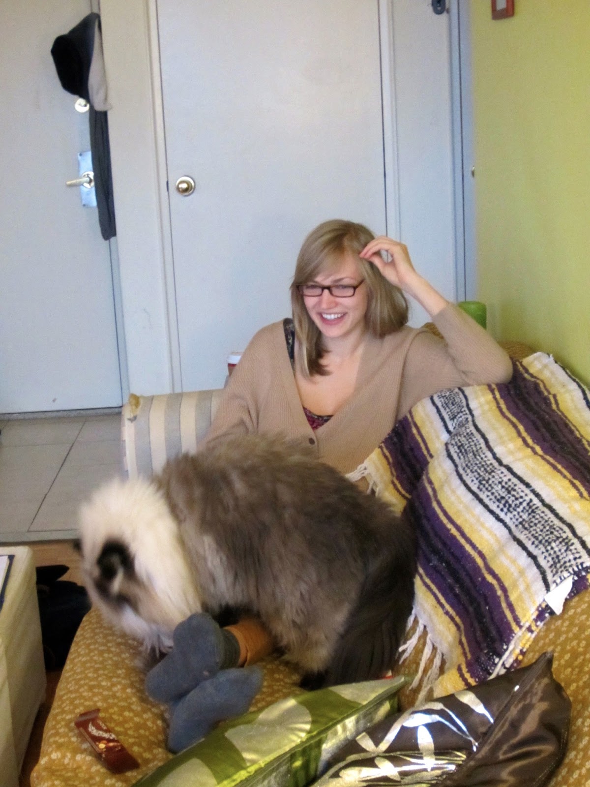 When she first got to my apartment, she stopped at the door to take her boots off. Unbeknownst to her, Kitten was coyly watching her from around the corner.  She was none too impressed to look up to see some pervy cat watching her.